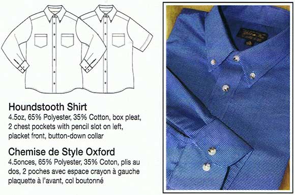 • 4.5 ounce fabric • top fused collar • button down collar • box pleat • placquet front • adjustable cuffs • two front pockets except for style 32, 36 which are one pocket