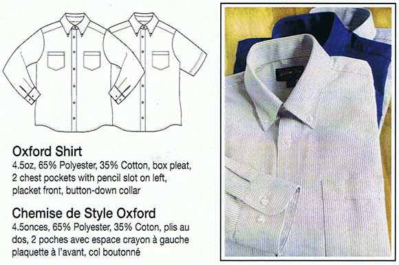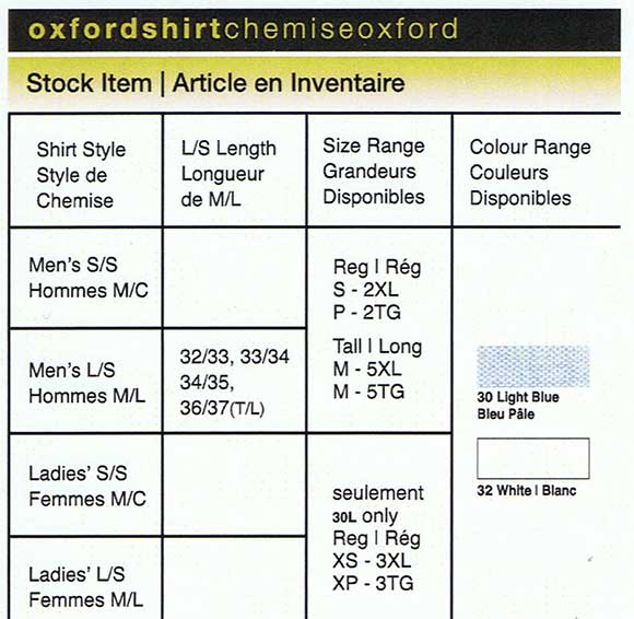 • 65% polyester/35% cotton • stock item • short sleeve available • for men: solid oxford 30, 32, 36 • for ladies with one pocket only: solid oxford 30L, 36L